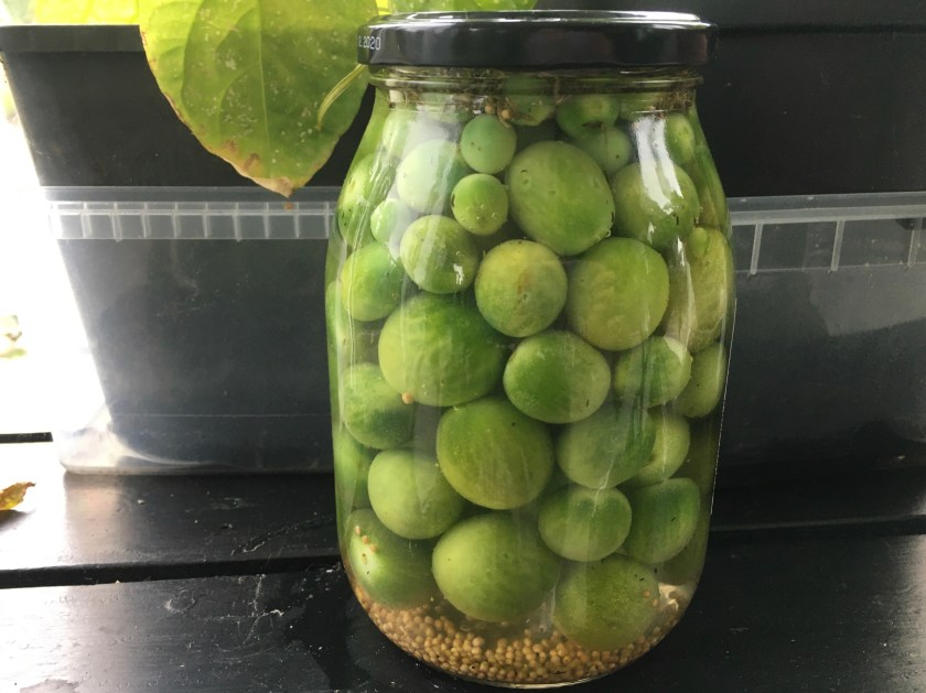 For preserving a 1 litre jar of cucumbers or green tomatoes you need about 1/2 litre of salt water, so I am going to write the ingredients that you need for that. The quantity of cucumbers or tomatoes really depends on the size. You don’t actually need that much and is very simple to do. It takes about 3 weeks for the pickles to be done, but if you put them somewhere in the sun it takes even less, about 2 weeks. Ingredients cucumbers/green tomatoes (to fit in a 1 litre jar) 1/2 litre water 30g salt 1 teaspoon black peppercorns 1 teaspoon white wine vinegar 1 bayleaf 1 garlic clove 1 teaspoon dry thyme 1 teaspoon mustard seeds 1/2 teaspoon sugar a few slices of horseradish root Directions Boil the water with the salt and the bayleaf and let it cool down. In the meantime, put the cucumbers or the tomatoes in the jar and add all the other ingredients. One important thing to do here, if you pickle tomatoes, pierce them a few …